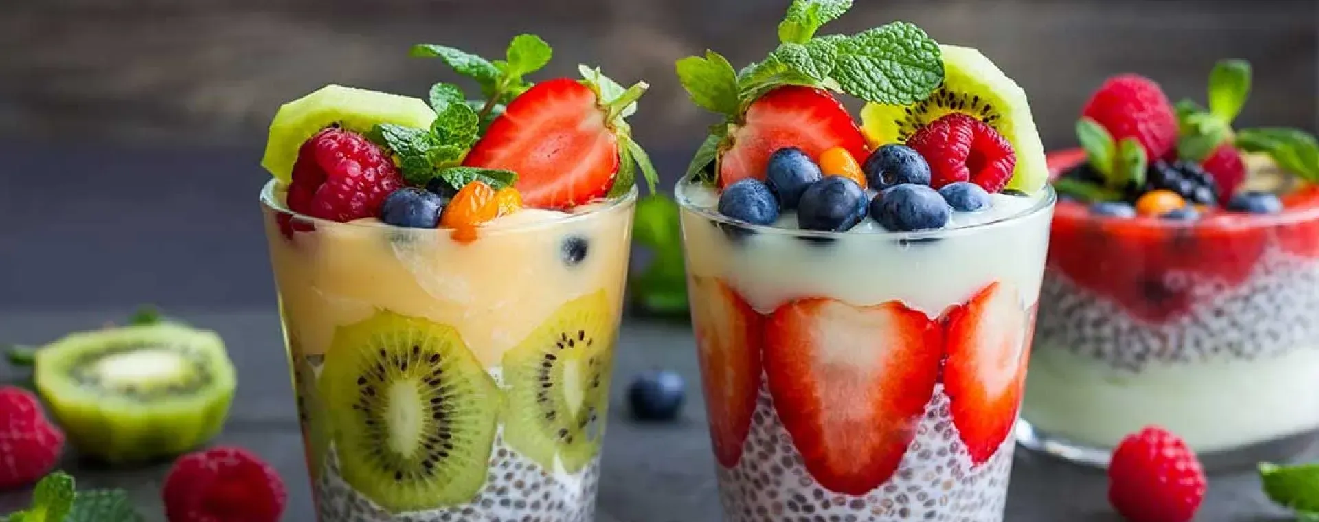 - Spoon the chia pudding into serving glasses, alternating with layers of fruit and granola.