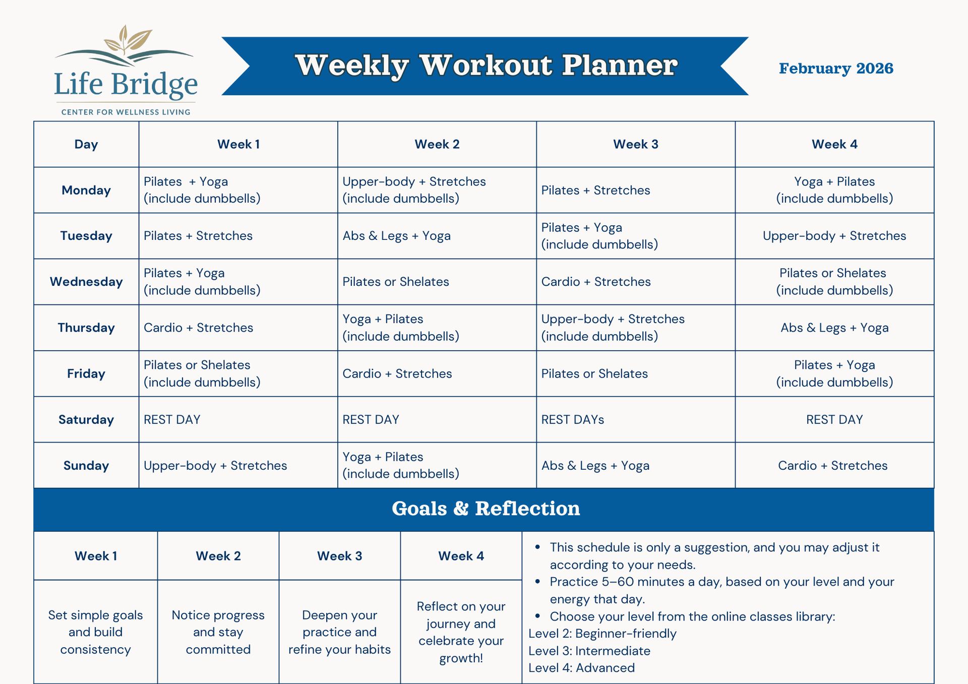 Your guided weekly routine for strength, flexibility, mindfulness, and steady progress.