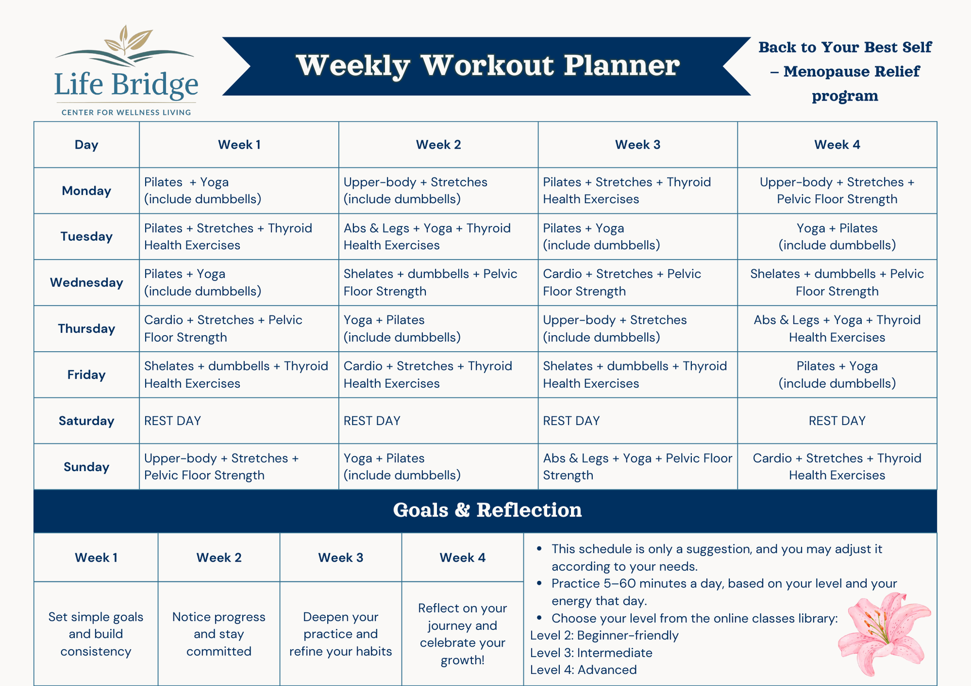 Your guided weekly routine for strength, flexibility, mindfulness, and steady progress.