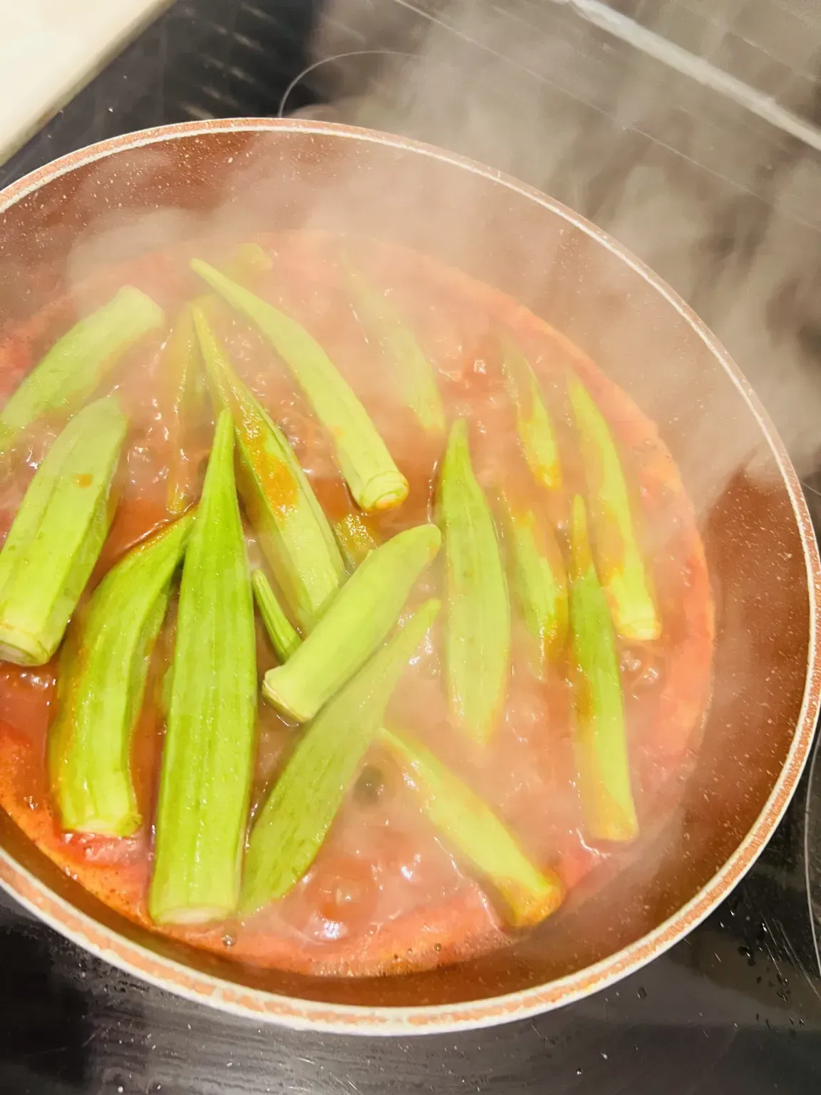 - Add the okra to the pan, bring everything to a gentle boil, then reduce heat and simmer until the okra is tender.