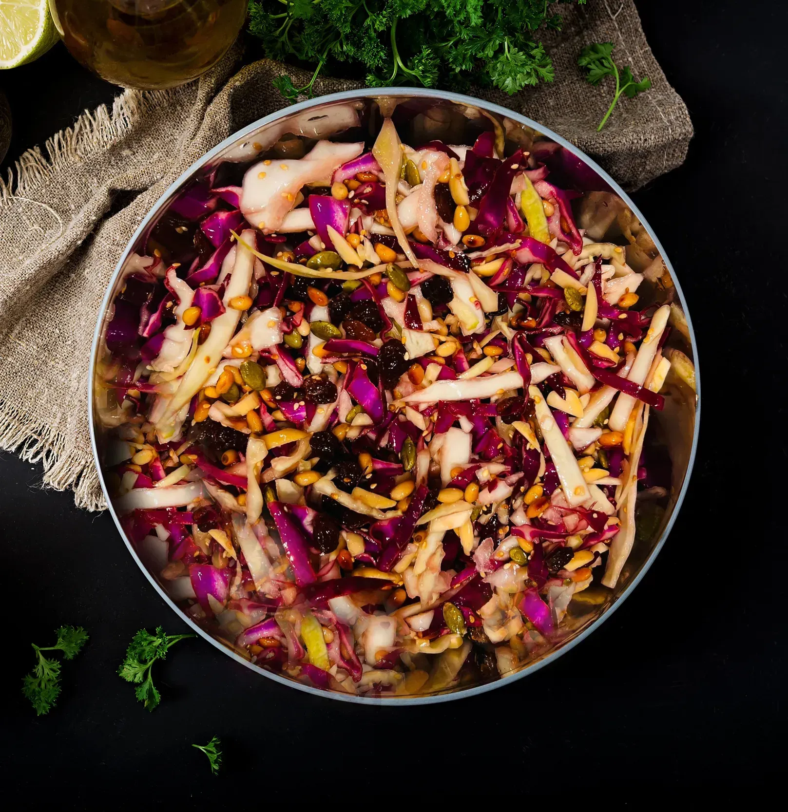 In a large bowl, combine the green cabbage, purple cabbage, raisins, and all the toasted nuts and seeds. - Add the dressing: