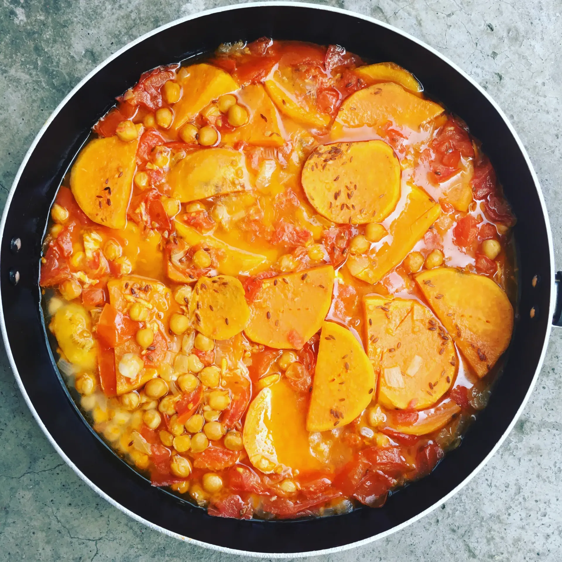 - Add the sweet potato, tomatoes, cumin seeds, salt, tomato paste, and chickpeas.